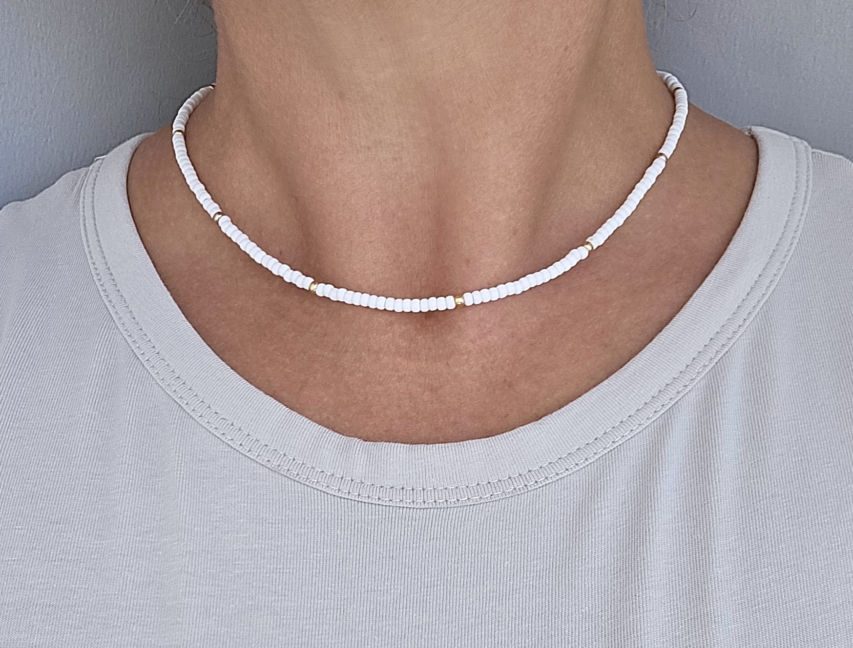 Imeilus käsitööna valminud valge kaelakee. Kvaliteetsed Miyuki klaashelmed 3mm. kuldsed detailid. Pikkus 39cm+ 5cm pikendatav.