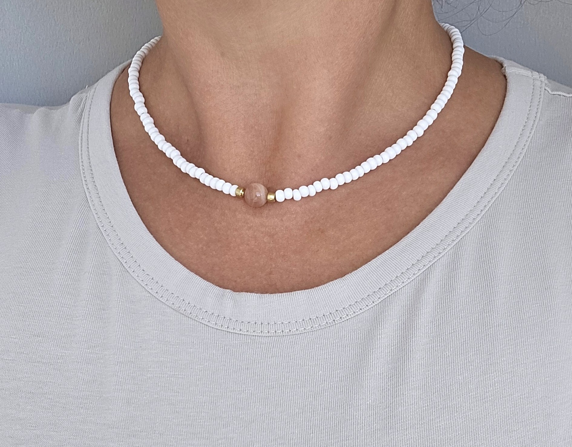 Imeilus klaashelmestest kaelakee päikesekiviga. 3,5mm seemnehelmed, kuldsed detailid. pikkus 40 cm + 5cm pikendatav.
