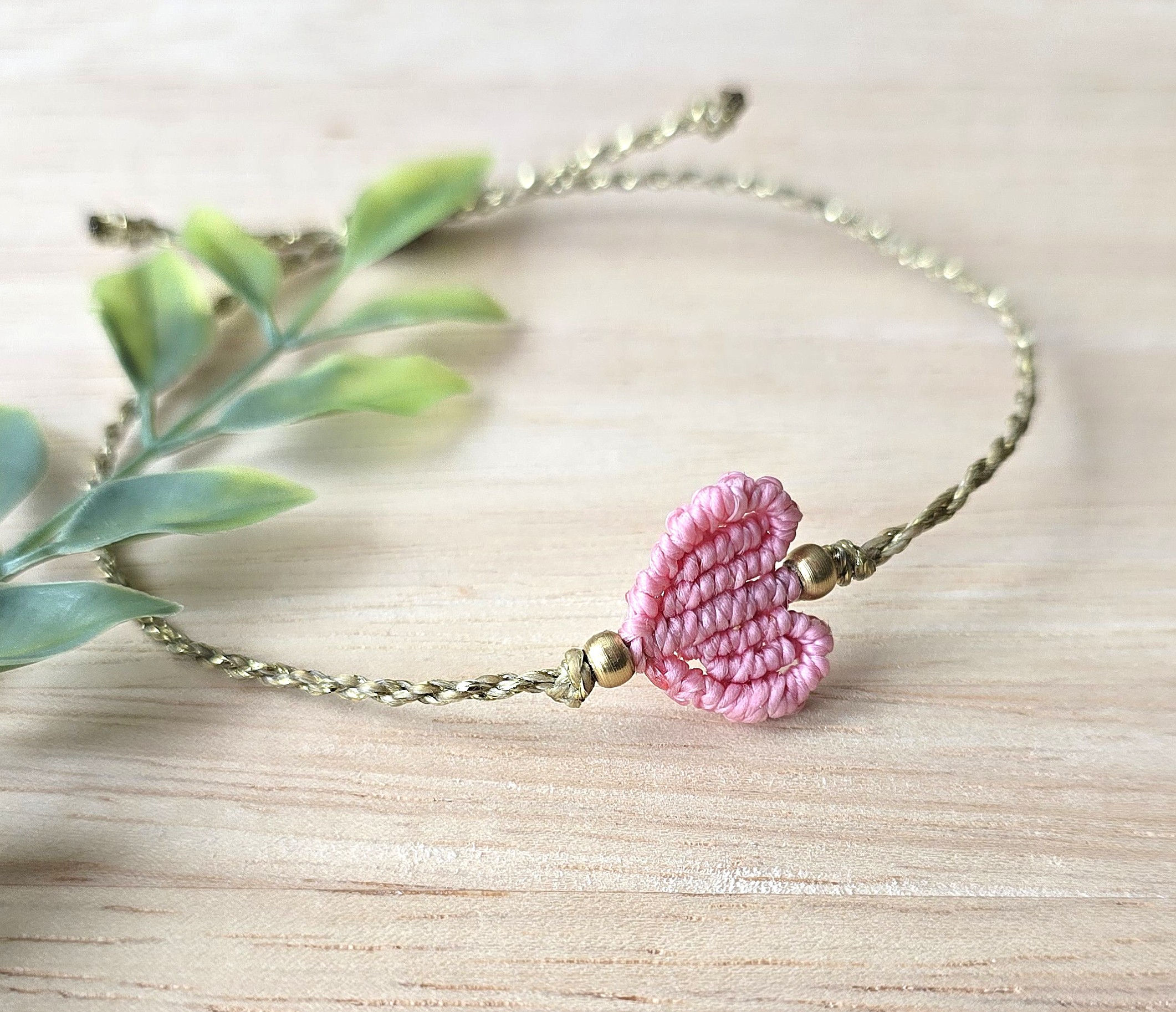 Käsitsi punutud makramee käepael roosa südamega.