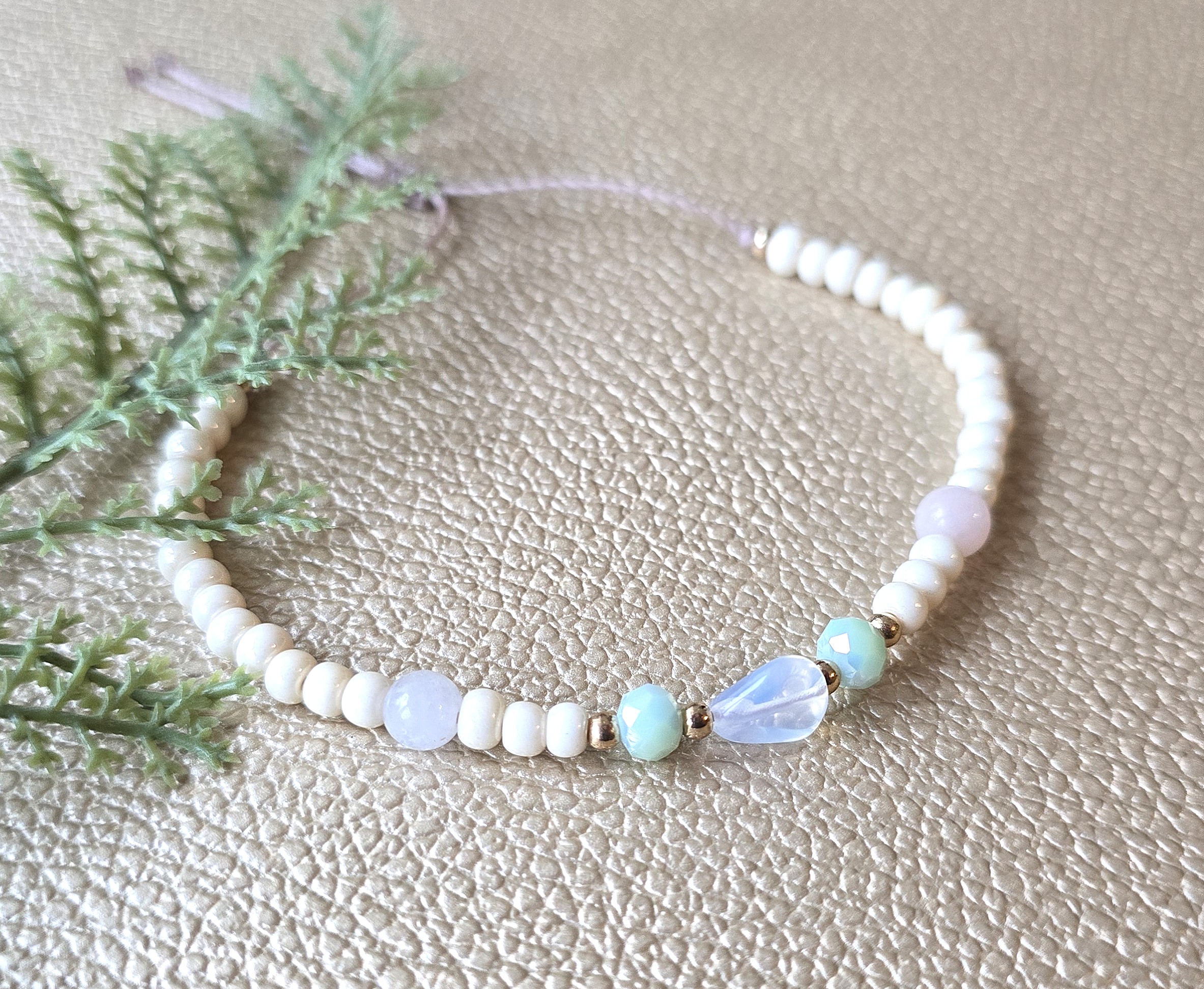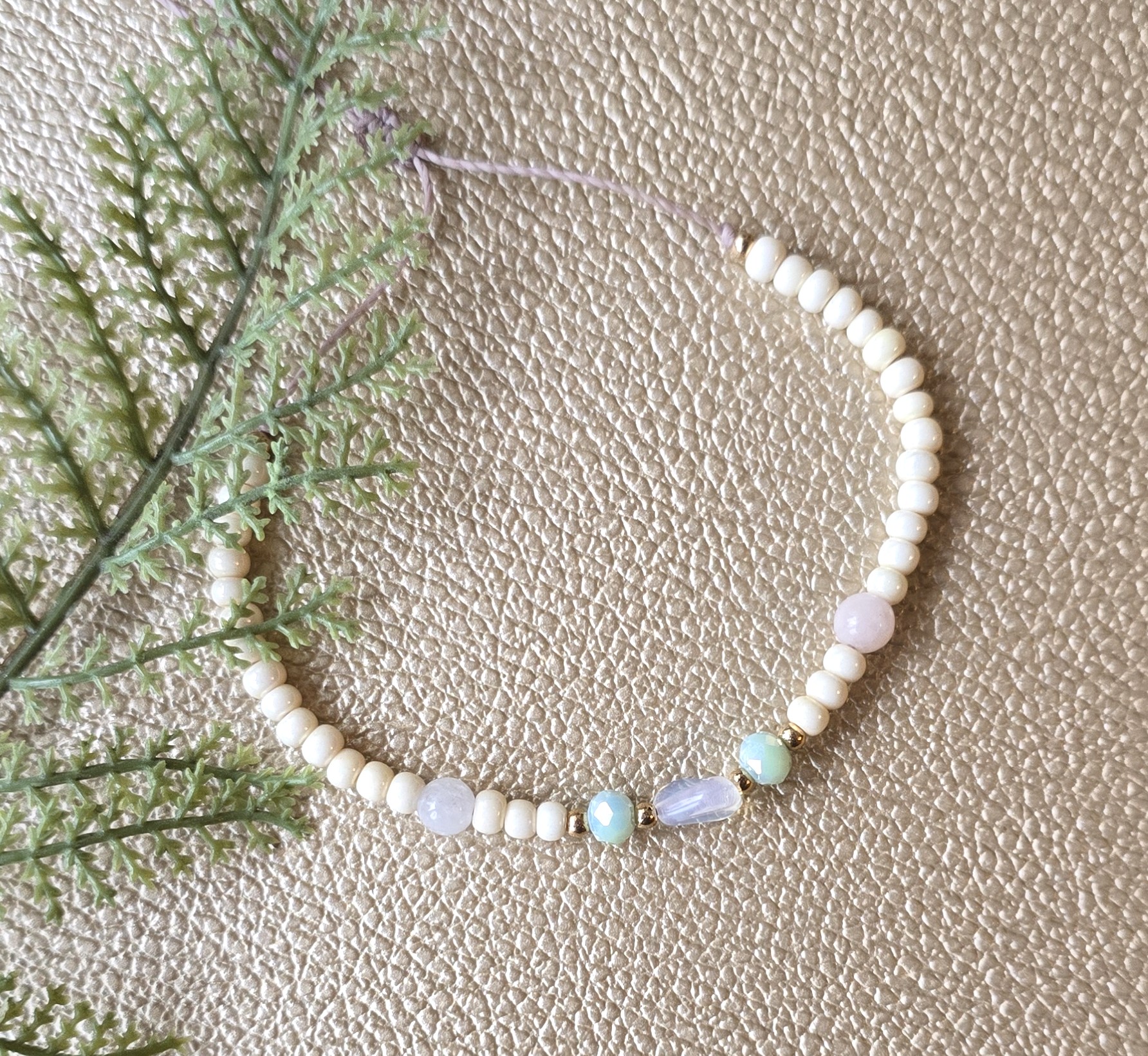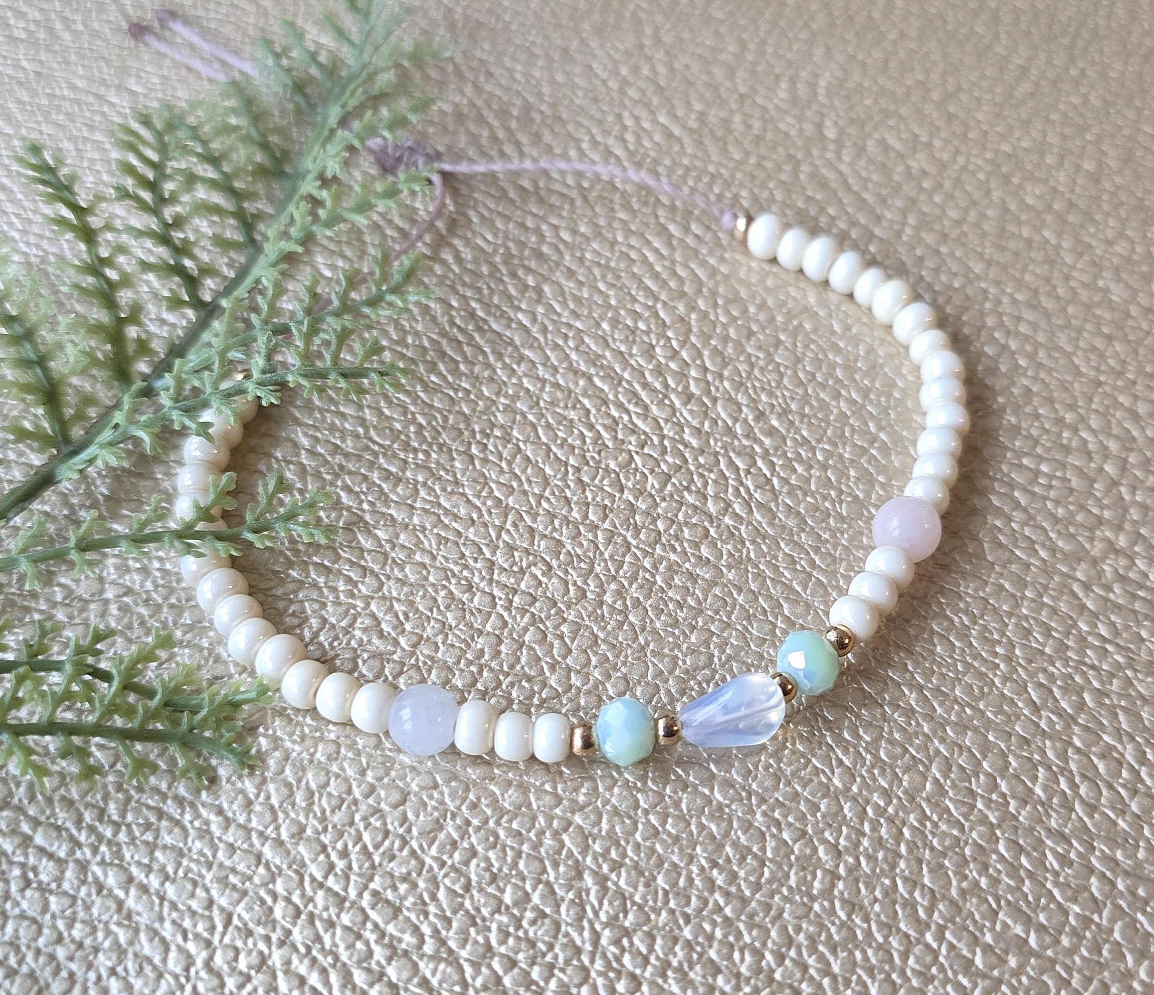 Ainulaadne käsitsi valmistatud käevõru opaali ja kahe roosa kvartsiga. Erinevad klaashelmed, mugav libisev kinnitus.