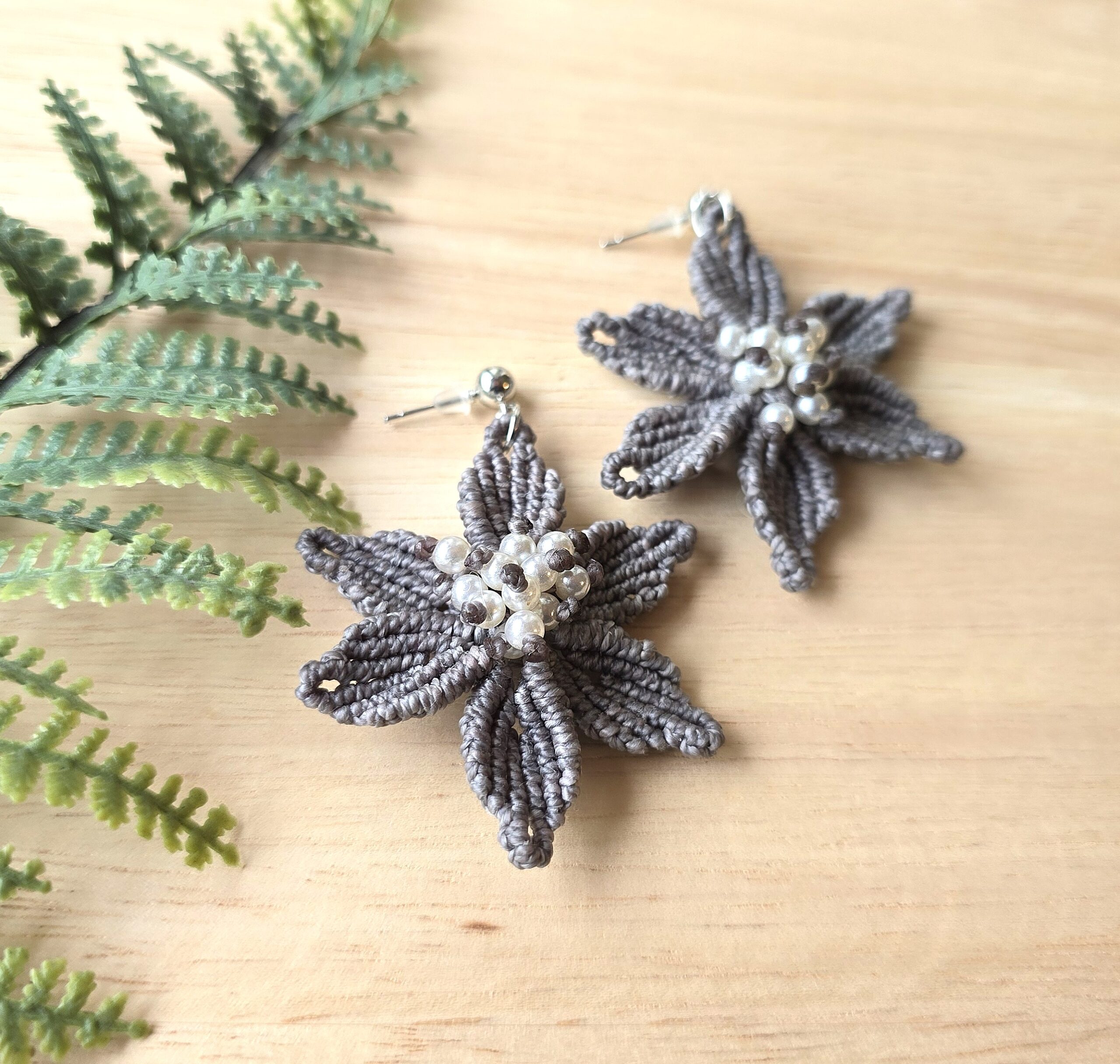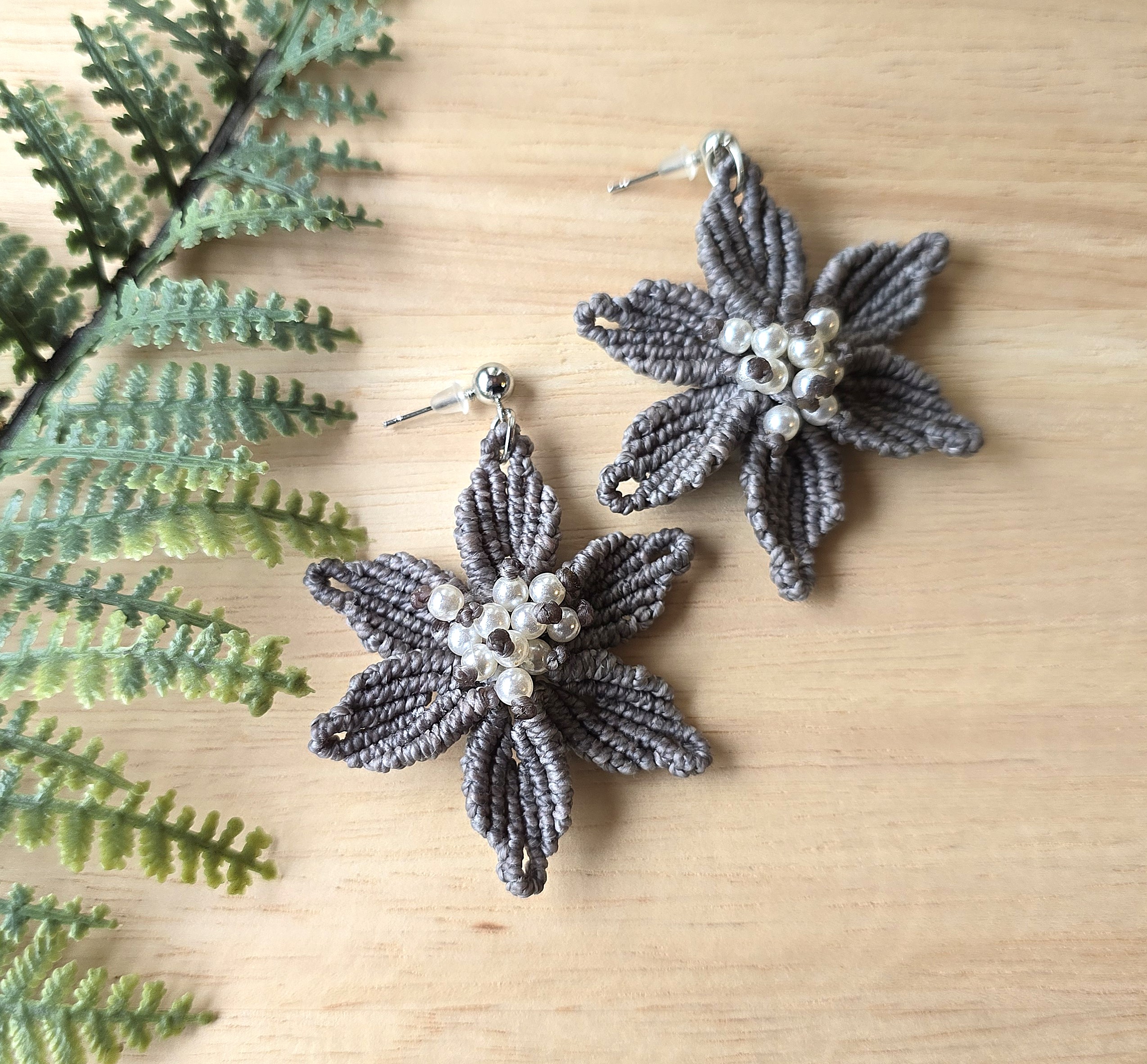 Kaunilt liilia õie kuju, mis lisab romantilist ja loodusest inspireeritud hõngu. Universaalne hall , mis sobib suurepäraselt nii igapäevaseks kandmiseks kui ka pidulikumateks sündmusteks. Kaunistatud väikeste valgete pärlitega, mis lisavad peent sära ja elegantsi. Kvaliteetne makramee nöör ja kergad pärlid, tagades mugava ja kerge kandmise terveks päevaks. Iga paar on käsitsi punutud, mis teeb neist ainulaadse ja isikupärase kunstiteose.